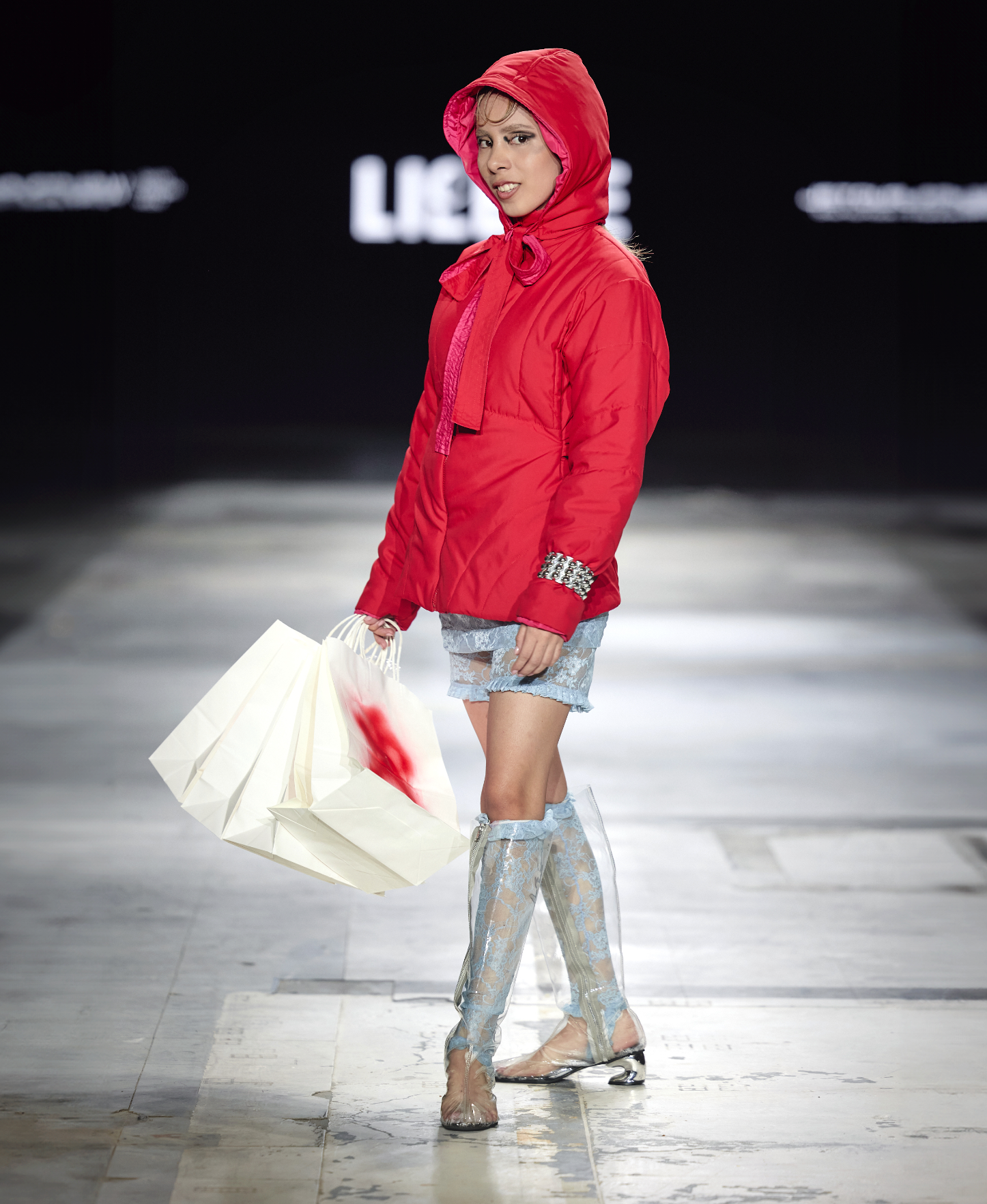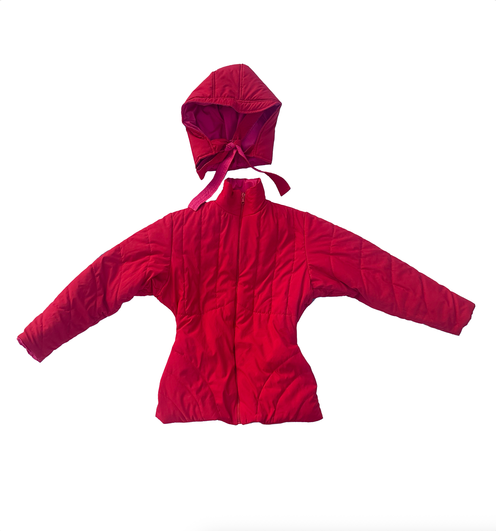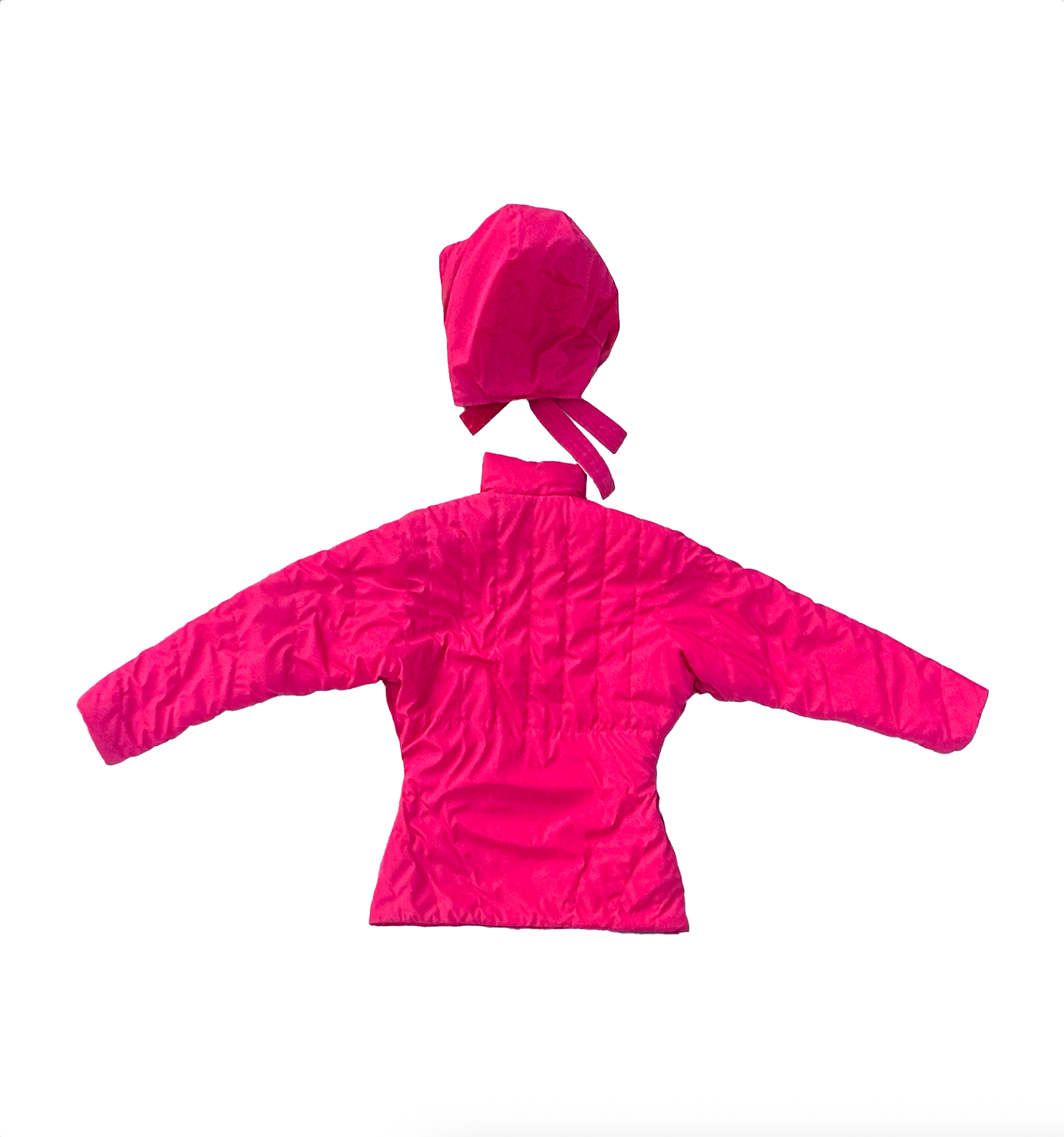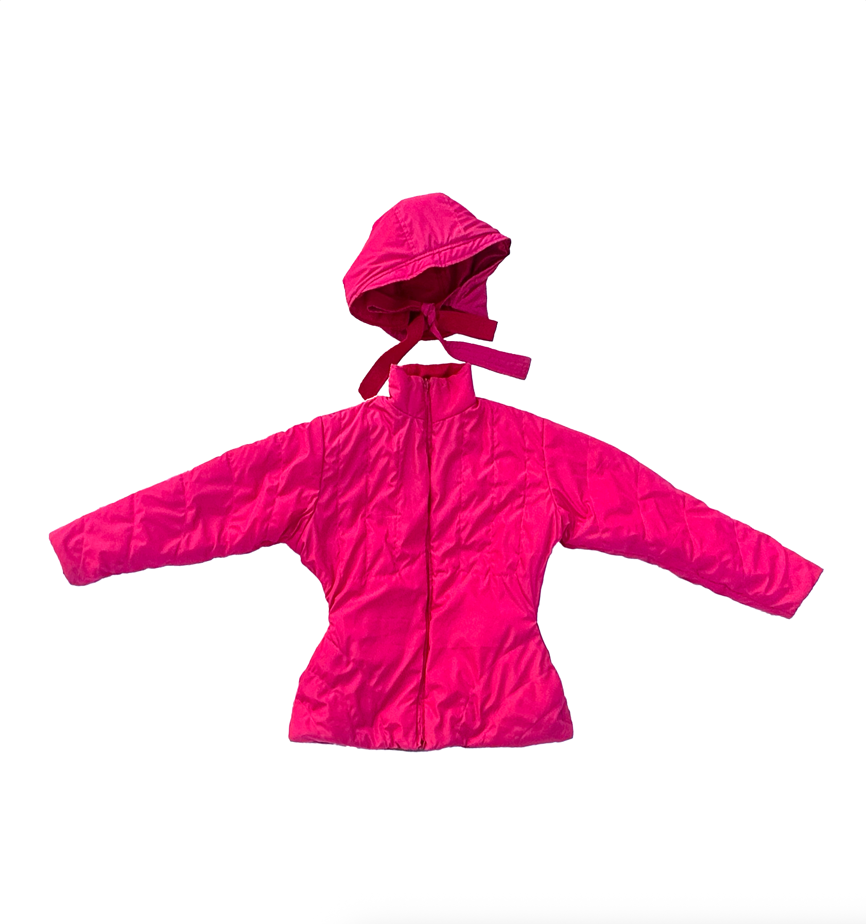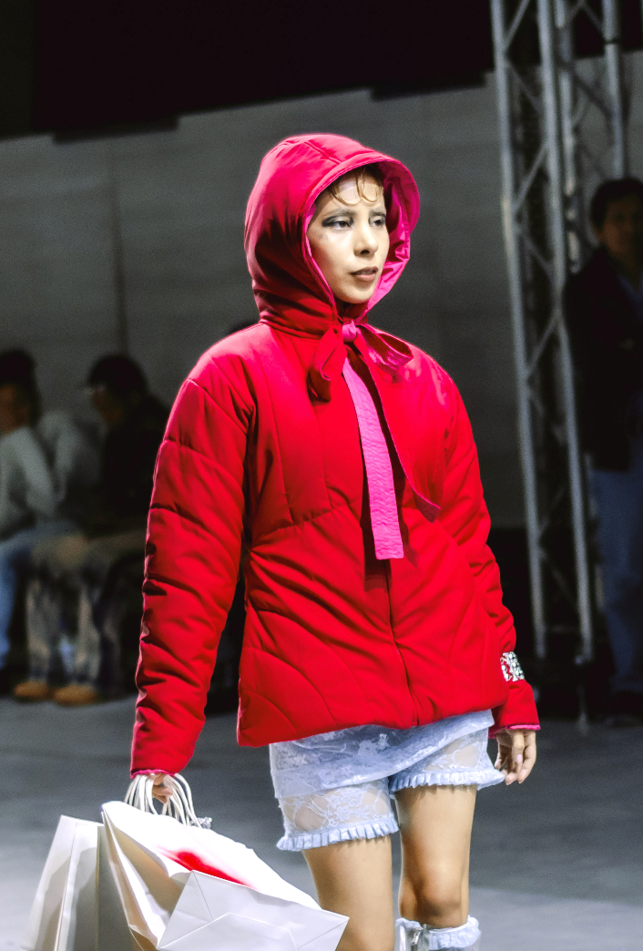 Chompa impermeable y reversible, con capucha separada con formas futuristas que acentúan la cintura.