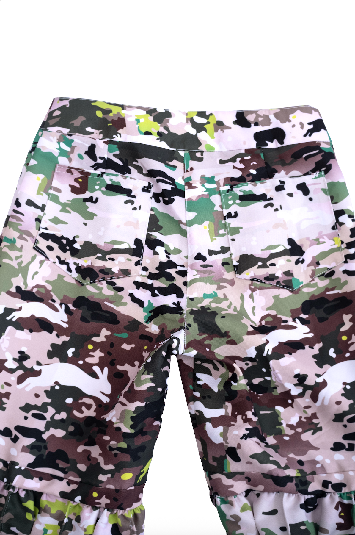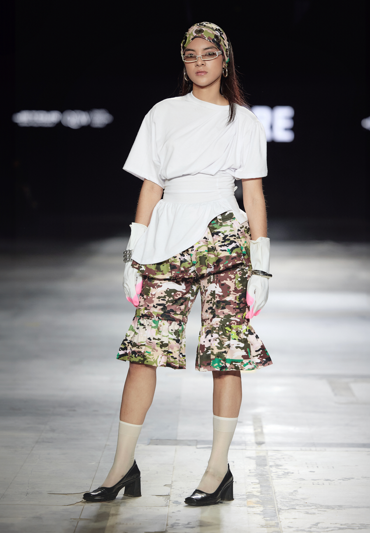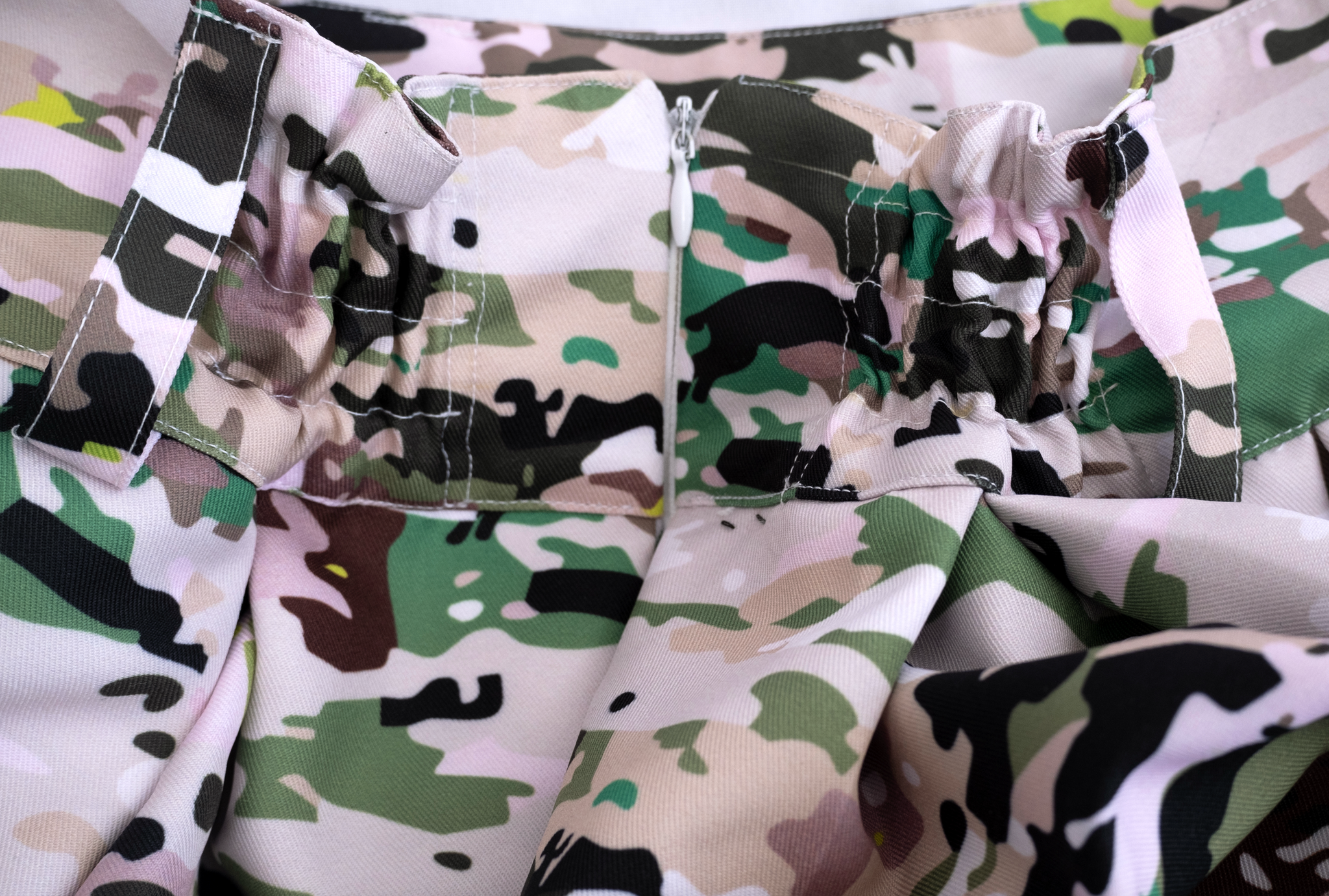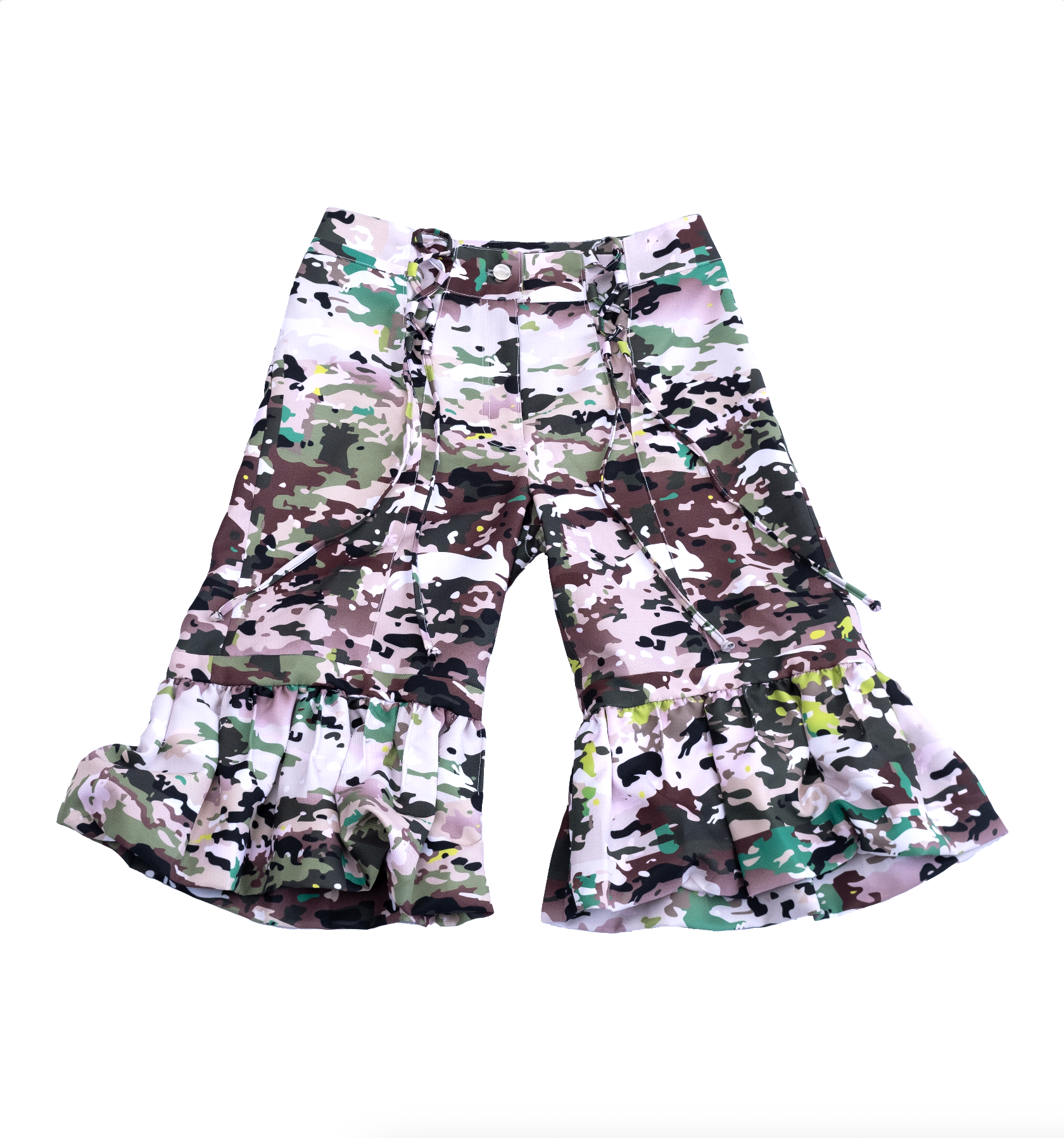 Conjunto teatral y cómodo de dos piezas, falda y jort, de casimir sintético sublimado o de denim negro, con tiras que permiten regular el ancho de la cintura.